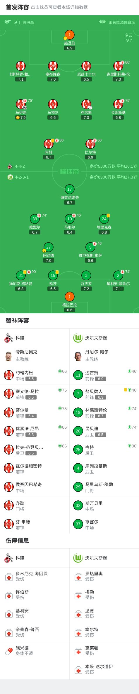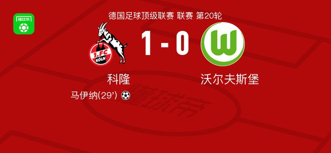 北京时间1月31日德国足球顶级联赛 联赛 第20轮,科隆主场对阵沃尔夫斯堡。科隆马伊纳破门。最终比分科隆 1-0 沃尔夫斯堡。